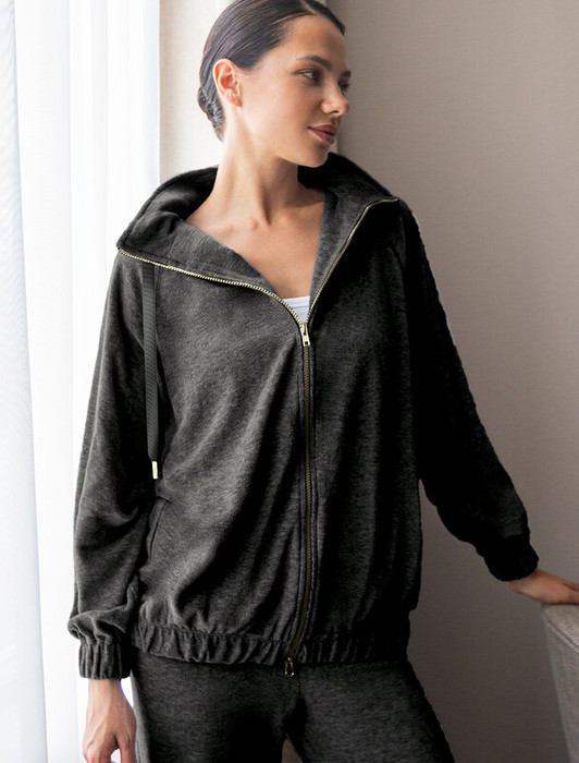 Худи на двухсторонней молнии выполнено из бархатистого велюра. Модель дополнена резинкой по низу и боковыми карманами. Легкий и мягкий материал с матовой фактурой придает изделию нежность и комфорт. Хорошо держит тепло и форму – идеальное решение для домашнего отдыха. Сочетается в костюме с брюками D44.117