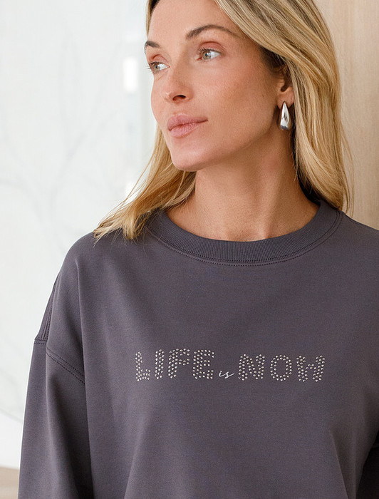 Свитшот выполнен из эластичного футера двухнитки. Изделие дополнили лаконичным принтом стразами в тон изделия. Расслабленный стиль поддерживает спущенная линия плеча, свободный силуэт и разрезы по бокам. Модель сочетается в костюме с брюками D44.135, D44.136, D44.137 и юбкой D46.034