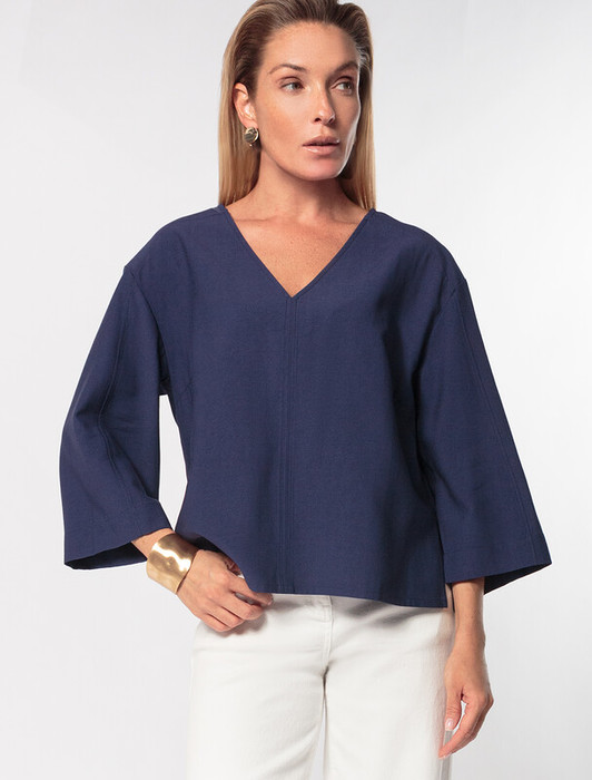 Свободная блузка со спущенным плечом выполнена из плотного лиоцелла. Добавление синтетических волокон в составе изделия предотвращает сминаемость. Модель с V-вырезом дополнена боковыми разрезами и декоративным швом спереди. Подходит для любой фигуры. Для создания расслабленного образа, сочетайте в костюме с брюками D24.214, D24.218, шортами D28.054 и юбкой D26.181