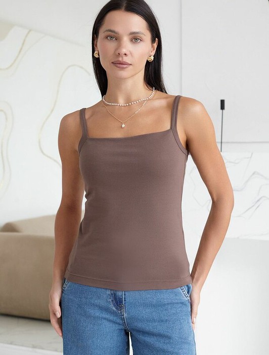 Совместные покупки Сургут Женская одежда Майки, топы — 21.04 Vilatte Топ с двуслойной зоной бра на бретелях из хлопка D43.168 т.кофейны