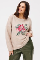 Свитер прямого силуэта из пряжи с хлопком связан рельефным узором с косами и ромбами. У модели рукава-реглан и воротник без отворота.