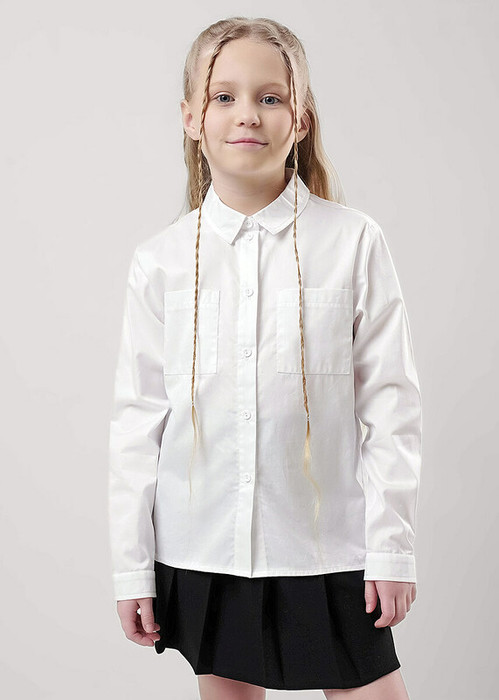 Базовая белая рубашка из поплина станет отличным дополнением к вашему гардеробу. Воротник со стойкой, планка и манжеты на пуговицах. Модель умеренного объёма дополнена накладными карманами. Рубашка идеально подойдёт для школьных и повседневных образов.