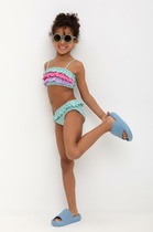 Слитный купальник на лямках для девочки. Украшен оборками. Внутри подклад. Оригинальная набивка выполнена из стойких гипоаллергенных красителей.