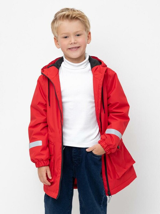 Демисезонная куртка для мальчика с утеплителем SEE®: 120 г/м2. Выполнена из мембранной ткани с дополнительной тефлоновой обработкой. Данный вид обработки предохраняет изделие от загрязнения и лучше отводит влагу. Подклад из 100% полиэстера. У изделия предусмотрена защита подбородка. Несъемный капюшон имеет эластичную утяжку со стопперами. Низ рукавов на эластичной резинке для лучшего прилегания. На талии утяжка при помощи шнура со стопперами. По бокам два накладных кармана с клапанами. Во всех изделиях верхнего ассортимента для безопасности ребенка предусмотрены светоотражающие элементы.