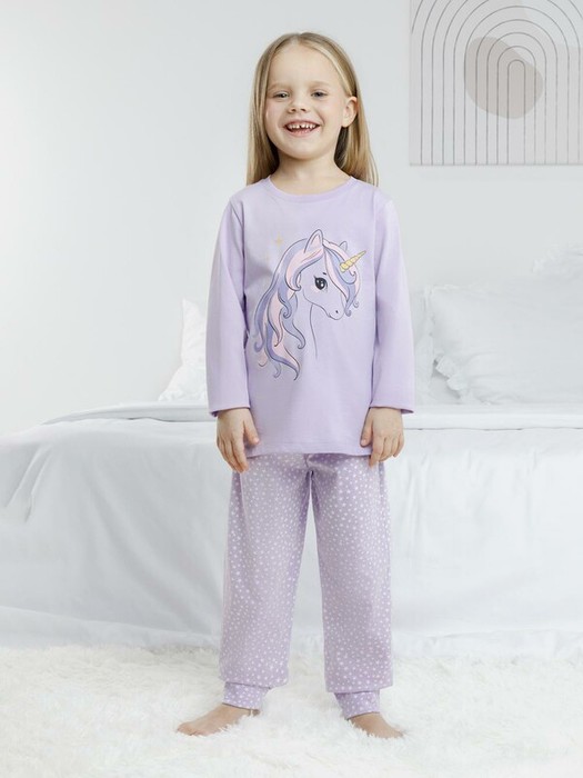 Пижама для девочки из натурального хлопка. Джемпер с длинными втачными рукавами и брюки с эластичной резинкой в поясе. Мягкие манжеты по низу брюк сделаны из материала в рубчик. Оригинальная набивка и принт выполнены из стойких текстильных гипоаллергенных красителей. Изделие сохраняет цвет и форму после многократных стирок. Все трикотажные полотна производятся в соответствии с нормами швейцарского сертификата ЭкоТекс.