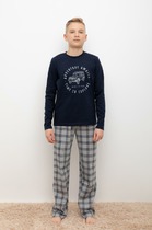 Трикотажная пижама из натурального хлопка. Футболка с короткими втачными рукавами изготовлена из эластичного трикотажа в рубчик. Брюки с эластичной резинкой в поясе выполнены из гладкого трикотажа супрем. Оригинальная набивка выполнена из стойких текстильных гипоаллергенных красителей. Изделие сохраняет цвет и форму после многократных стирок. Все трикотажные полотна производятся в соответствии с нормами швейцарского сертификата ЭкоТекс.