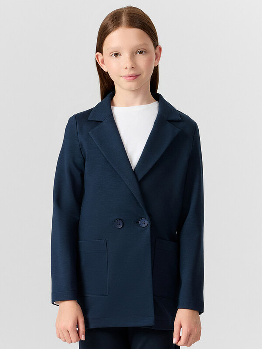 Жакет двубортный, прямого силуэта, диной до линии бедер.