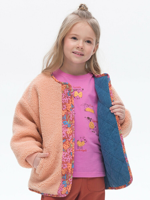 Джинсовый двусторонний бомбер прямого мягкого силуэта-оверсайз для девочек. С одной стороны стеганая ромбами джинсовая ткань с синтепоном, с другой - искусственный тедди мех "барашек". Застежка на кнопки - удобно ребенку любого возраста. Со стороны меха отделка из курточной ткани в цветочный принт. Карманы наклонные с листочкой - не порвутся и удобно пользоваться. Широкие рукава на манжете из рибаны - тепло и можно брать на вырост. Такая весенняя куртка органично подстраивается под любой вариант низа: классический, кэжуал, спортивный. Можно носить с юбками и брюками.