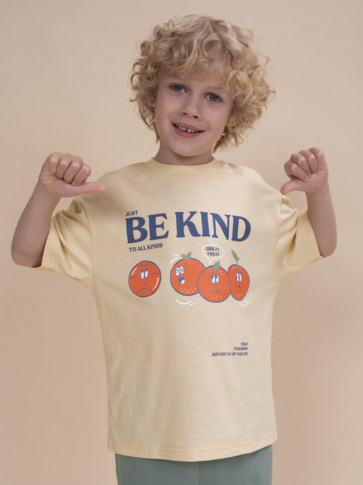 Модель представлена в бежевом цвете. Универсальный вариант на любой выход. Футболка для мальчика с принтом украшена надписью "Just be kind to all kind today tomorrow & every day of your life" – перевод "Просто будь добрым ко всем сегодня завтра и каждый последующий день". На картинке изображены фрукты и мячик с эмоцией веселого настроения. Изделие привлекает забавным дизайном. Футболка для мальчика подростковая рассчитана на возраст садика и школы. Размерная линейка: 1 (86); 2 (92); 3 (98); 4 (104); 5 (110); 6 (116); 7 (122); 8 (128); 9 (134); 10 (140); 11 (146).