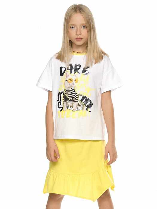 Комплект для девочек футболка и юбка. Футболка актуального мягкого оверсайз силуэта со спущенным плечом. Фотопринт и текстовый неоНовый принт с серебряным металликом и глиттером, перевод Осмелься быть другой. Это круто быть мной.. Юбка Новинка. Умеренный объем, по низу юбки пришит фигурный волан. Пояс на комфортной внутренней резинке.
