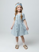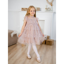 Нарядное платье, слегка расширенное к низу. Горловину украшает изящная стойка, застёжка на две пуговицы по спинке. Фишка платья в пышных рукавах, объём которых достигнут за счет густой сборки оката. Сборка рукава по внутреннему шву на эластик позволяет регулировать длину. Перед декорирован сказочным принтом с серебряным металликом и пайетками.