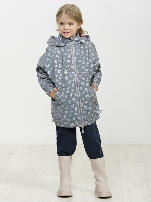 Плащ на тонком подкладе. Рекомендуемый температурный режим не ниже плюс 10 градусов. Ткань со световозвращающим покрытием и голограммным серебряным металликом. Водоотталкивающее покрытие. Куртка силуэта бочонок с сильно спущенной линией плеча и объемным рукавом. Карманы прорезные с листочкой. Тракторная молния с серебряным напылением. Стопперы в капюшоне декорированы надписью с серебряным покрытием. Объем по низу изделия регулируется эластиком со стопперами.