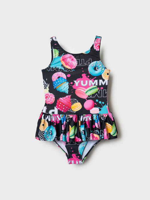 Слитный купальник для девочки подростка. Модель с удобными широкими бретелями, круглым вырезом спереди и глубоким U-образным на спине. Внизу пришита юбочка. Основной материал – эластичный трикотаж с насыщенным цветным принтом: пончики, капкейки, макаруны на черном фоне, дополненные яркими надписями. Внутри есть подкладка и гигиеническая вставка. По краям купальник обработан мягкой резинкой для комфортной посадки. Благодаря UF-защите, ткань сохраняет первоначальный вид даже при длительном пребывании на солнце. Подходит для плавания и активного отдыха.