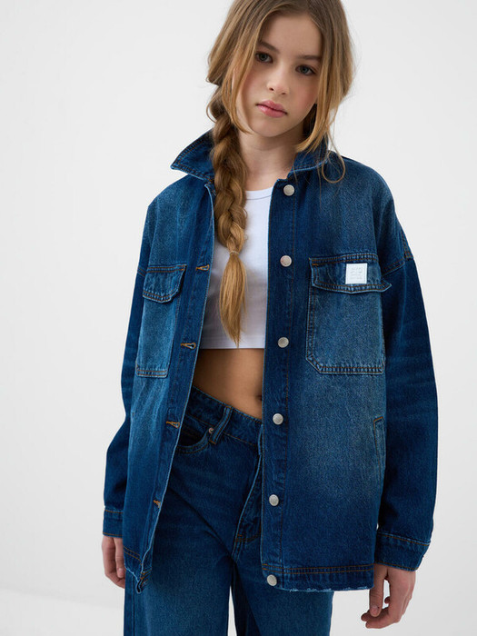 Джинсовая куртка оверсайз для девочки подростка. Выполнена из плотного синего денима. Спереди два накладных кармана и два боковых кармана. Застёгивается на металлические болты. На груди — фирменный резиновый логотип, а на спине под воротником — жаккардовая нашивка. Манжеты застёгиваются на кнопки. Низ изделия с бахромой.