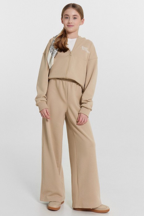 Брюки для девочек свободного силуэта. Пояс отрезной из основного полотна с эластичной тесьмой внутри 50RV. По поясу проложены отделочные строчки. Низ брюк обработан швом в подгибку.