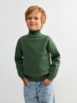Вязаный джемпер для мальчика из полушерстяной пряжи. Высокий воротник с отворотом хорошо защищает от холода.  Длинные рукава с манжетами. Внизу эластичный пояс. Изделие сохраняет форму и стойкий цвет после многочисленных стирок.