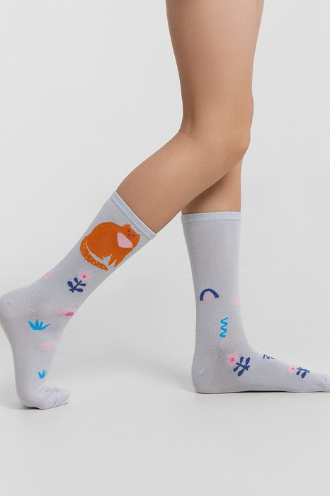 рис.3064 Детские классические носки с рисунком в виде котиков и цветочков.