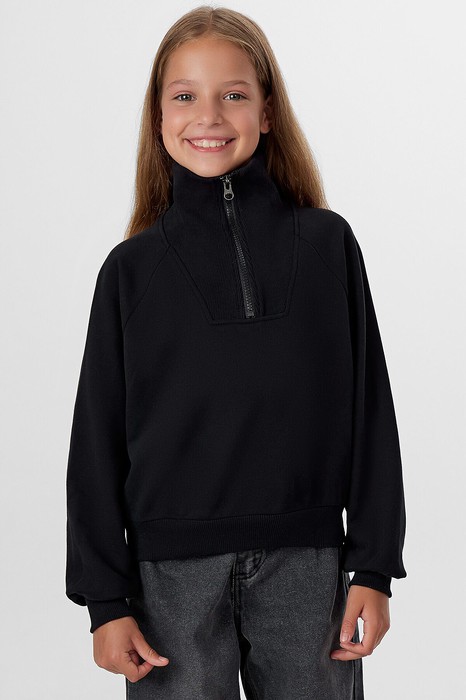 Свитшот свободного силуэта. Рукава длинные, реглан. Линия плеча спущена. Перед и спинка цельнокроенные. Горловина круглой формы с втачным воротником из рибаны. По переду изделия застежка-молния. По низу рукавов и джемпера притачены манжеты и пояс из рибаны.