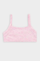 Бюстье из трикотажной кулирки. Горловина округлой формы. Спинка фигурная, как в спортивном топе. Все срезы окантованы бейкой из основного полотна. По нижнему срезу настрочена жаккардовая эластичная тесьма.