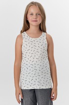 Топ для девочек прилегающего силуэта. Горловина круглая. Проймы и горловина окантованы бейкой из основного полотна. Низ изделия обработан швом в подгибку.