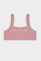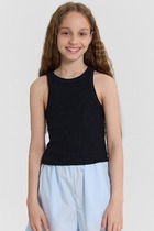 Топ для девочек прилегающего силуэта. Горловина круглая. Проймы и горловина окантованы бейкой из основного полотна. Низ изделия обработан швом в подгибку.