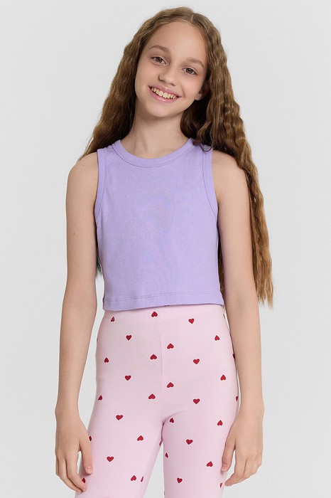 Топ для девочек прилегающего силуэта. Горловина круглая. Проймы и горловина окантованы бейкой из основного полотна. Низ изделия обработан швом в подгибку.