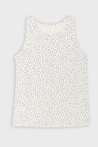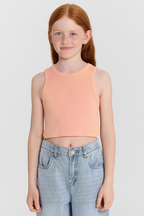 Топ для девочек прилегающего силуэта. Горловина круглая. Проймы и горловина окантованы бейкой из основного полотна. Низ изделия обработан швом в подгибку.