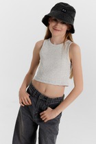 Топ для девочек из рибаны, облегающего силуэта, длиной ниже уровня талии. Перед и спинка цельнокроеные. Горловина круглая. Горловина и проймы окантованы широкой бейкой из основного полотна. Низ изделия обработан швом в подгибку.
