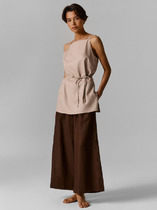 Брюки-бананы из интерсофта свободного кроя с боковыми карманами, зауженные к книзу. Широкий эластичный пояс со шнуром.