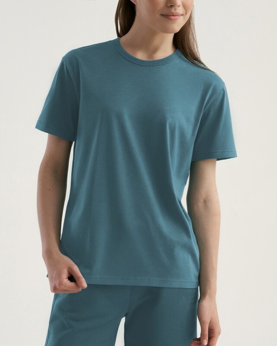 Boyfriend крой, укрепление по горловине спинки, круглый вырез. Горловина рибана. Отстрочка по горловине переда