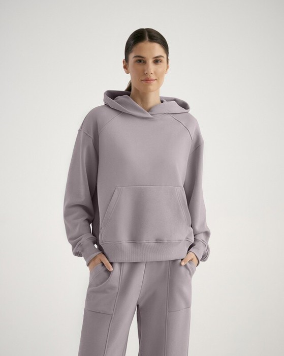 Худи женский свободного силуэта. Двойной капюшон с одним швом, притачные кокетки по переду, втачной рукав с локтевым швом. Карман "кенгуру".  Манжеты и пояс из кашкорсе.