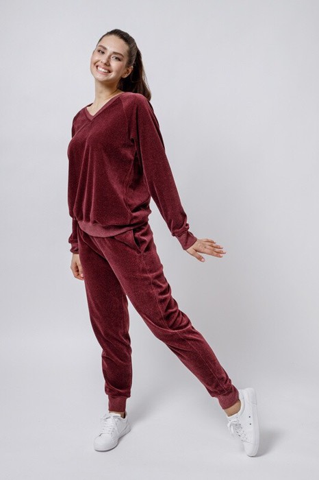 Джемпер свободного кроя с поясом и манжетами, рукав реглан, V вырез . Декор вышивка на спине. Брюки зауженные к низу на манжете, карман в боковом шве.