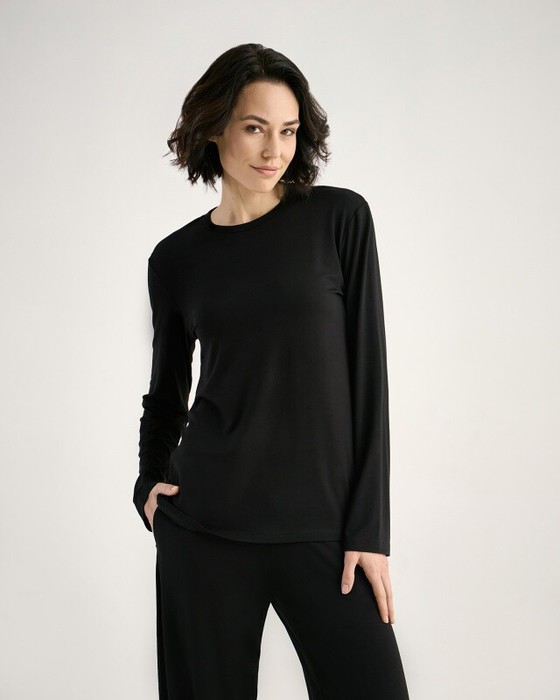 Лонгслив женский из бамбука,свободного силуэта. Втачной длинный рукав. Горовина окантована бейкой из основной ткани.