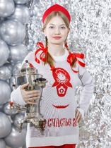 Свитшот выполнен из эластичного футера двухнитки. Изделие дополнили лаконичным принтом стразами в тон изделия. Расслабленный стиль поддерживает спущенная линия плеча, свободный силуэт и разрезы по бокам. Модель сочетается в костюме с брюками D44.135, D44.136, D44.137 и юбкой D46.034