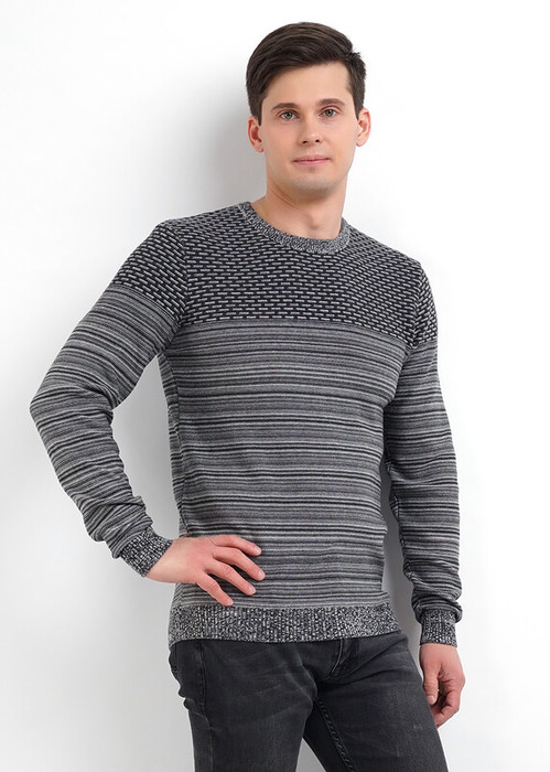 Вязаный джемпер с круглым вырезом горловины и длинным втачным рукавом. Интересное решение придает сочетание разных узоров вязания смесовой пряжи - вдоль кокетки и нижней половины изделия. Джемпер можно надеть как в прохладный вечер, так и рабочие будни.