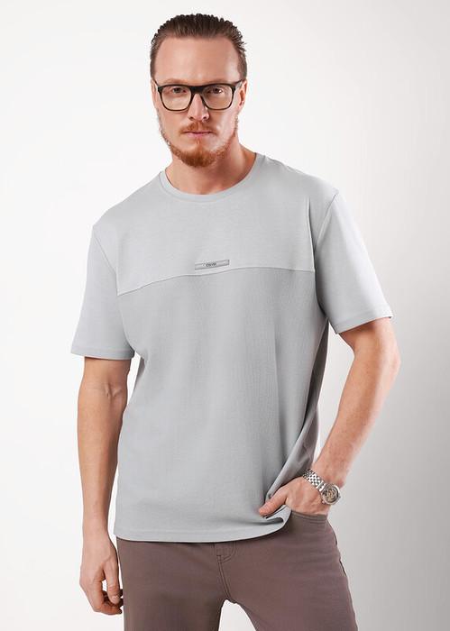 Футболка увеличенного обьема из комбинированной ткани: фактурное полотно и гладь. Интересное звучание модели придаёт дизайнерская нашивка спереди. Такая модель разнообразит любой образ и прекрасно подойдёт к спортивным брюкам или джинсам.