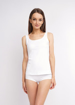 Майка из однотонного трикотажного полотна модал, с круглым вырезом горловины. Широкая бретель. Изделие очень легкое и комфортное в повседневной носке.