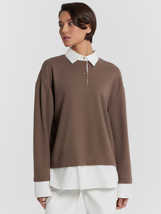 Уютный джемпер свободного кроя из плотного трикотажного полотна - интерлока с отделочными деталями из ткани - поплина. Отделочные детали имитируют выправленную из-под низа изделия рубашку. В боковых швах выполнены разрезы. Горловина обработана отделочным элементом - стояче-отложным воротником с отрезной стойкой. Воротник выполнен из отделочного полотна. На передней детали есть застежка-планка на три рубашечных пуговицы на два прокола на застежке-планке. Плечо спущено, пройма углублена, рукав втачной длинный с манжетами. Стильная и комфортная модель для создания оригинальных образов на каждый день!