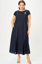 Платье из интерлока облегающего силуэта без рукавов.Глубокая горловина каре по  переду и спинке. Горловина и проймы обработаны бейкой их кулирного полотна в цвет швом «в чистый край». Узкое плечо. Перед цельнокроенный. Спинка со средним швом, припуски которого расстрочены. В низу шва обработан разрез. Длина изделия по колено.  Низ изделия обработан швом вподгибку на плоскошовной машине.