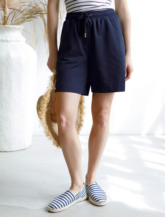 Шорты выполнены из футера двухнитки с эластаном. Модель прямого кроя дополнена боковыми карманами и одним задним карманом. Пояс выполнен из эластичного трикотажа в рубчик. В пояс вставлен плоский хлопковый шнур в тон изделия с серебристыми наконечниками. Изделие дополнено металлическим логотипом бренда. Сочетается в костюме с жакетом D49.078, джемпером D49.079, D49.080 и футболкой D49.081