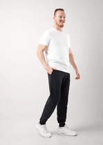 Мужские брюки из футера на манжете. Изделие дополняют функциональные карманы, имиджевя фурнитура и дизайнерский принт. Данные брюки станут незаменимым вариантом в прохладное время года.