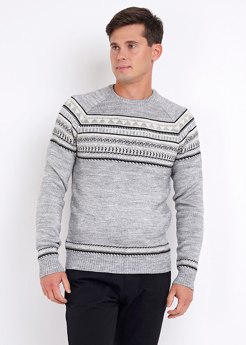 Мужской вязаный джемпер в скандинавском стиле, с очень эффектным и смелым узором по кокетке и низу изделия. Такое яркое и необычное изделие подойдет для уютных семейных вечеров и городских прогулок. Можно сочетать с темными джинсами и брюками.