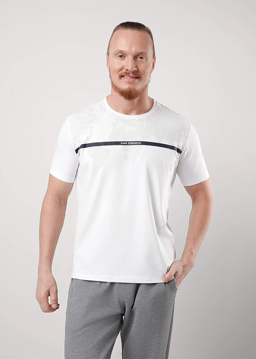 Стильная мужская футболка с круглым вырезом горловины из хлопкового полотна с эластаном. Модель с коротким втачным рукавом. Оригинальность изделию придает крупный графичный принт. Хорошо смотрится с брюками и джинсами.