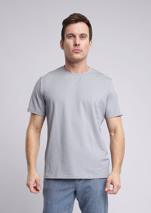 Базовая однотонная футболка стандартного объема с круглой горловиной, втачным рукавом из хлопкового полотна с добавлением эластана. Является неотъемлемой частью мужского гардероба.
