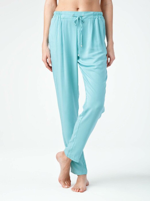 Брюки женские из однотонного текстильного материала свободного покроя. В боковых швах-карманы. Низ изделия обработан швом в подгибку. Верхний срез изделия обработан притачным поясом с резинкой по бокам и узкими завязками вставленными по-переду в люверсы.