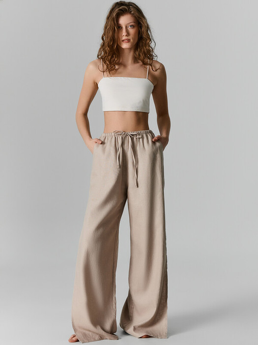 Брюки с посадкой на талии свободного силуэта. Пояс цельнокроеный с резиной внутри. По центру пояса пробиты петли, протянута бейка из основного полотна. В боковых швах выполнены высокие разрезы. На передних деталях карманы "хулиганы". Низ изделия обработан швом в подгибку.
