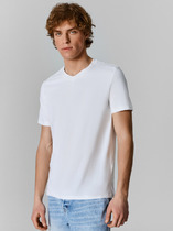 Нижние срезы футболки и рукавов обработаны швом вподгибку.