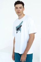Нижние срезы футболки и рукавов обработаны швом вподгибку.
