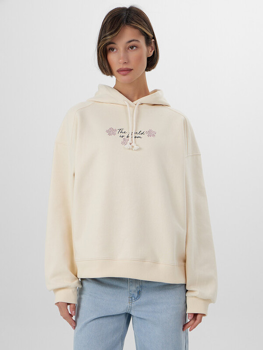 Бежевое худи с надписью «The world is bloom» («Мир цветёт») — это уютная модель для повседневной носки. Худи свободного кроя выполнено из мягкого трёхниточного футера с начесом, который сохраняет тепло и обеспечивает комфорт в прохладную погоду. Капюшон со шнурком и спущенная линия плеча создают расслабленный современный силуэт.