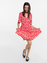 Нижняя часть платья с расклешением. Длина выше колен. Низ платья и рукавов обработан швом вподгибку.